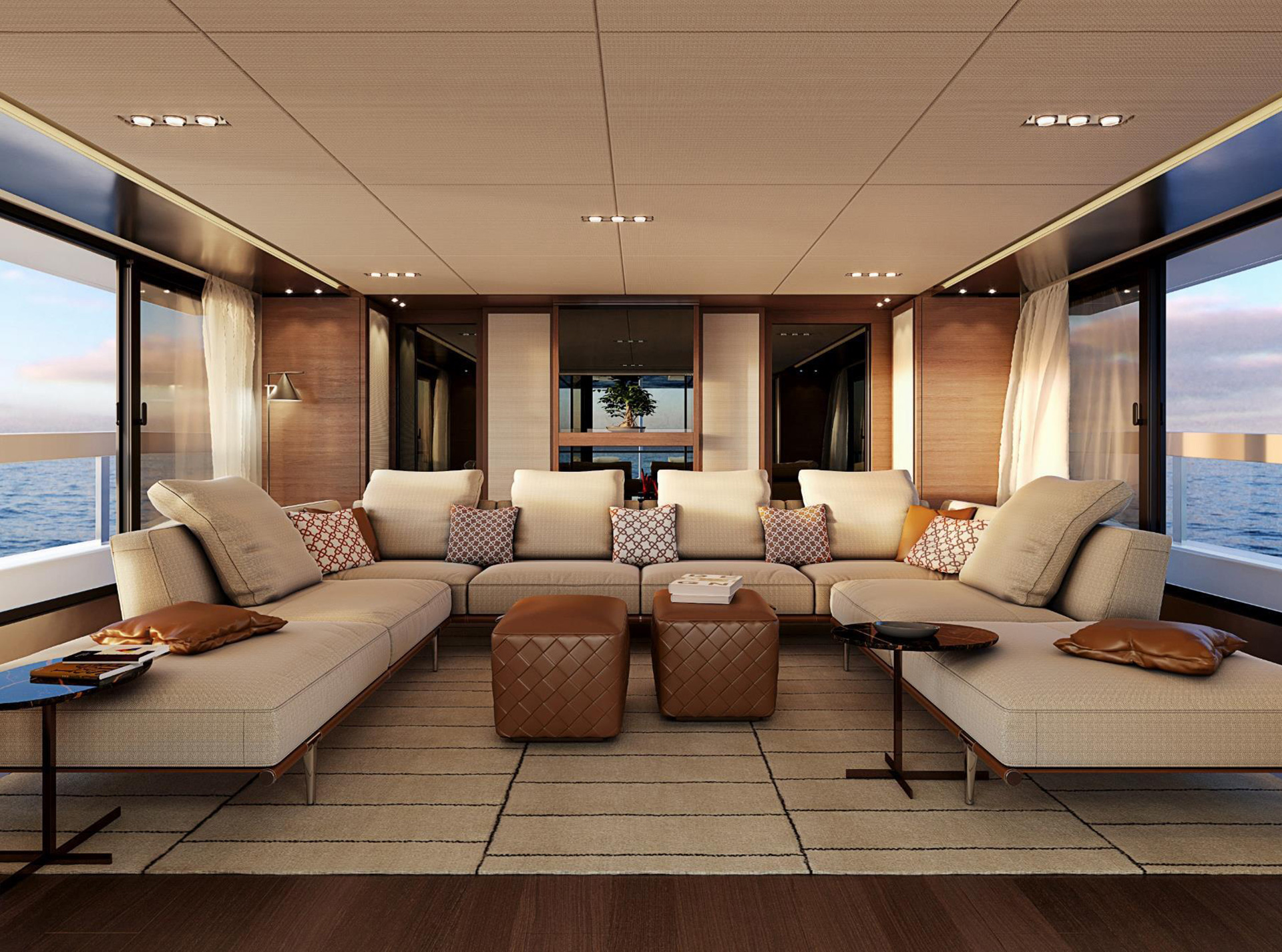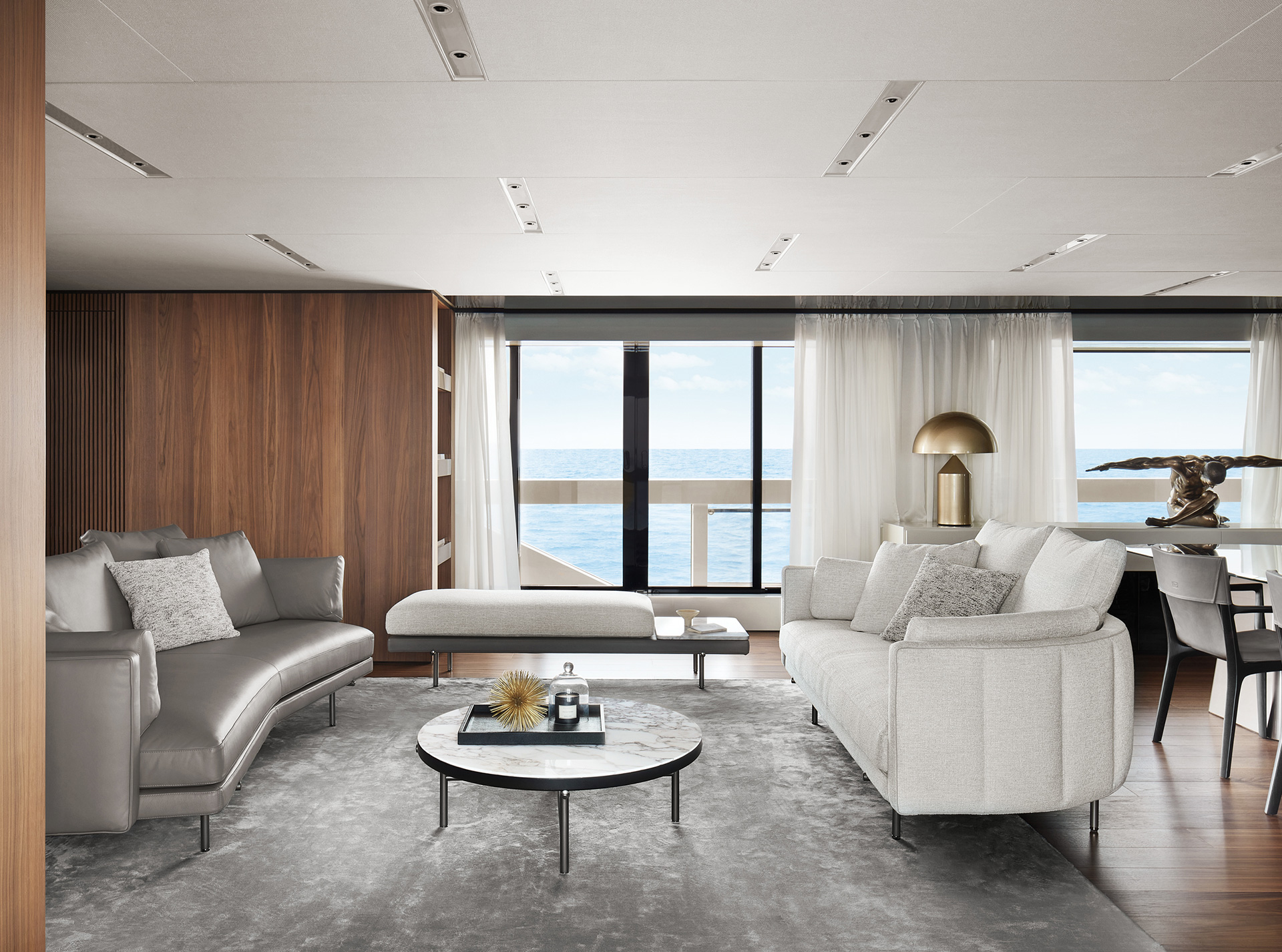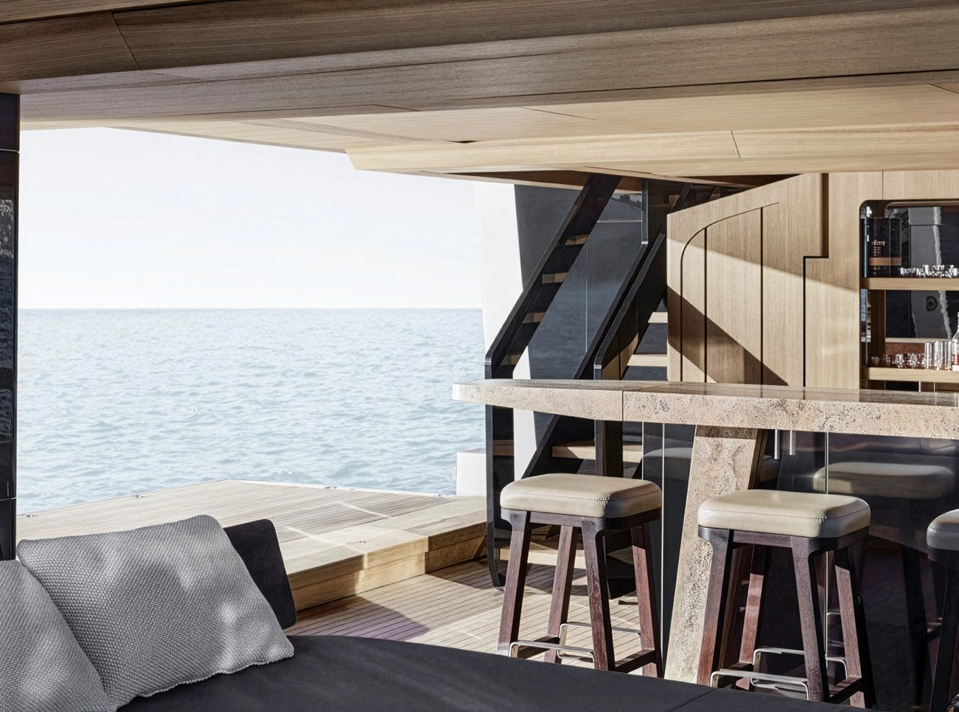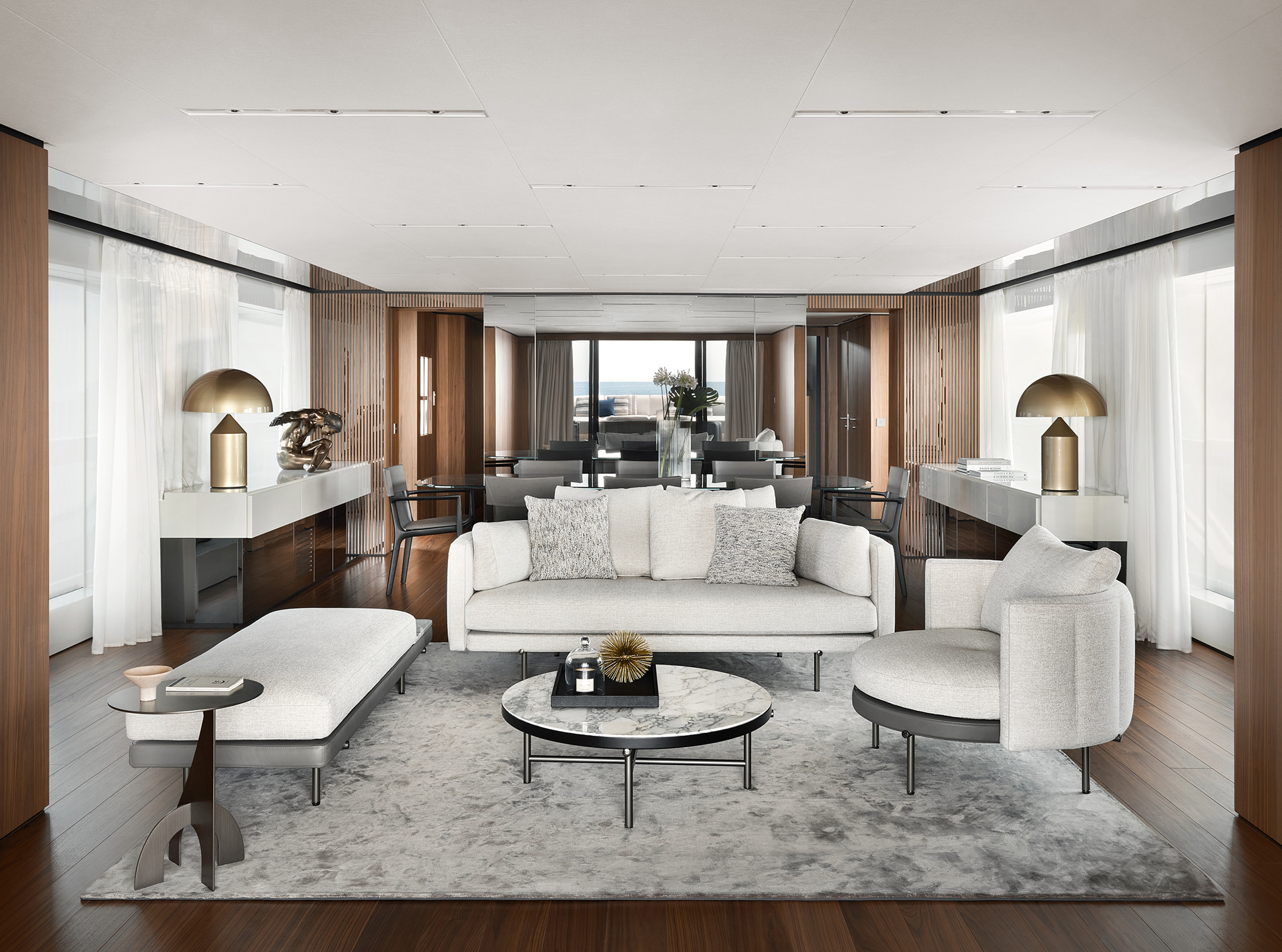 Interiors are conceived as fluid living spaces, where generous volumes, panoramic views and meticulously selected materials create a sanctuary of comfort and modern refinement, elegantly connecting interior and exterior life at sea.