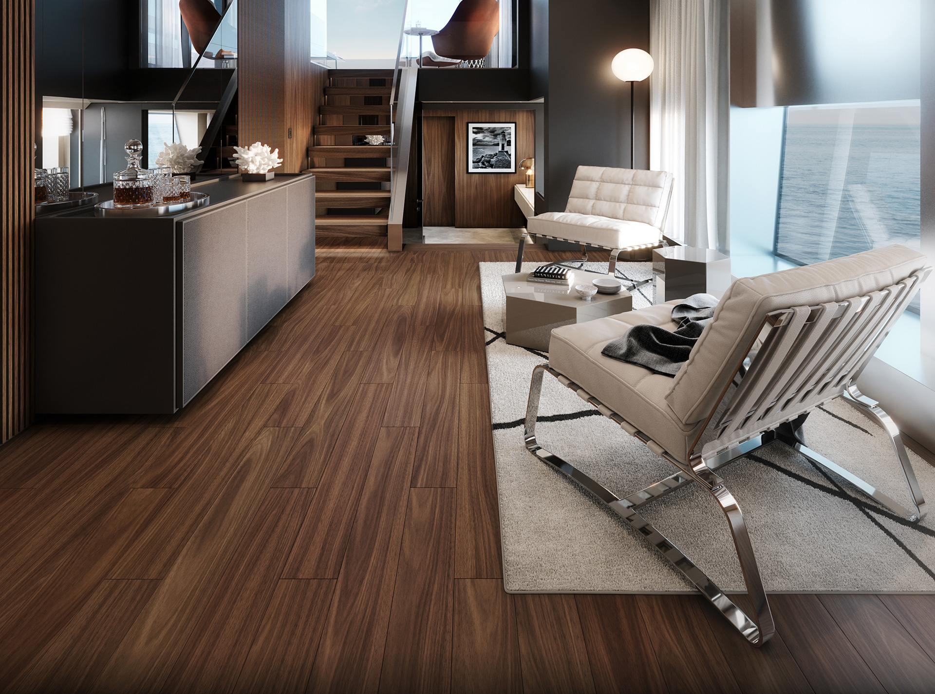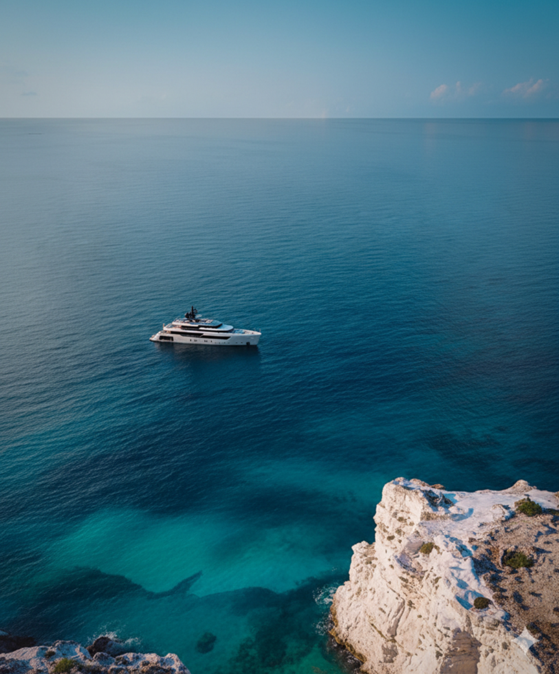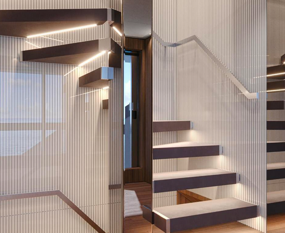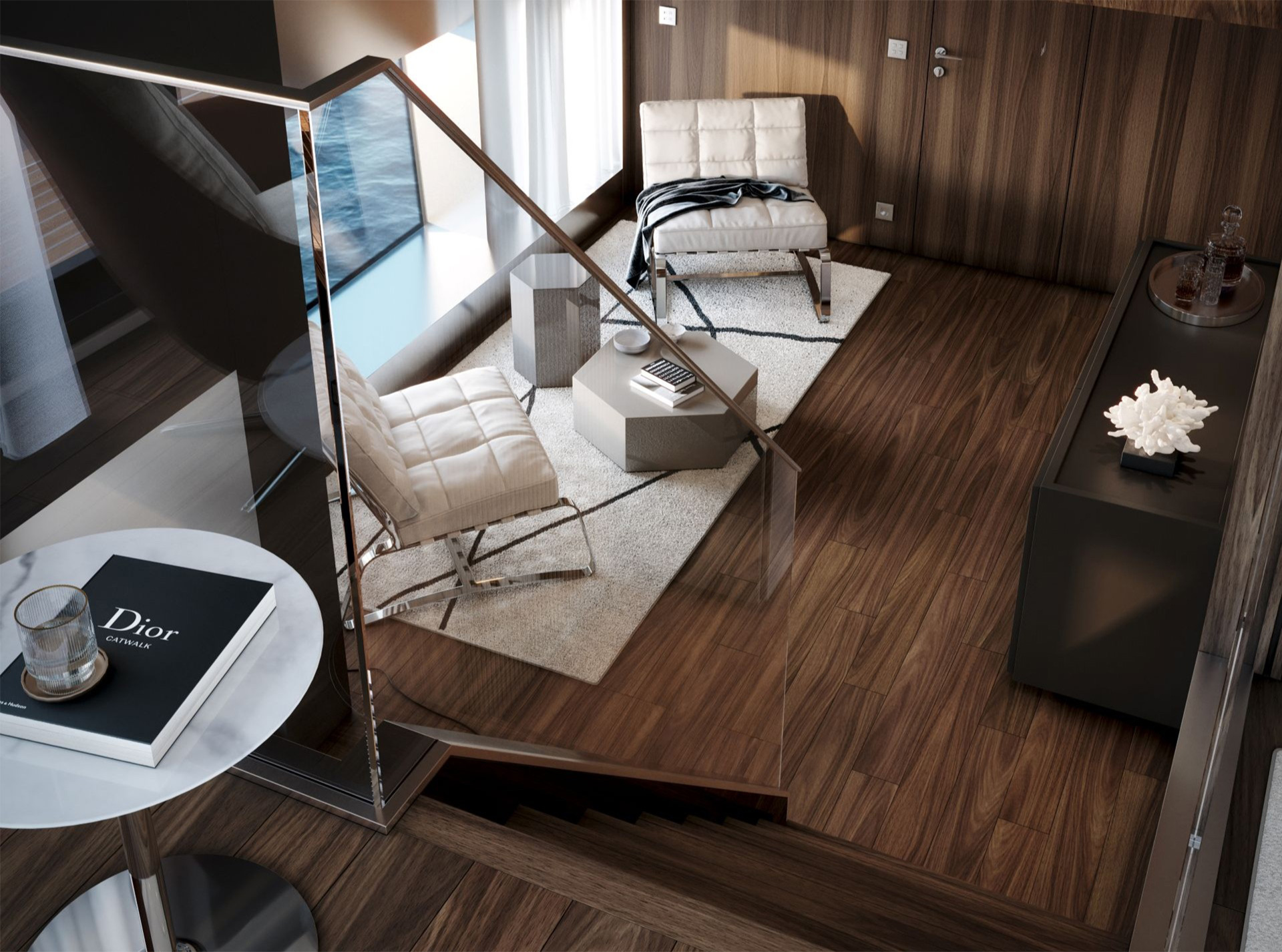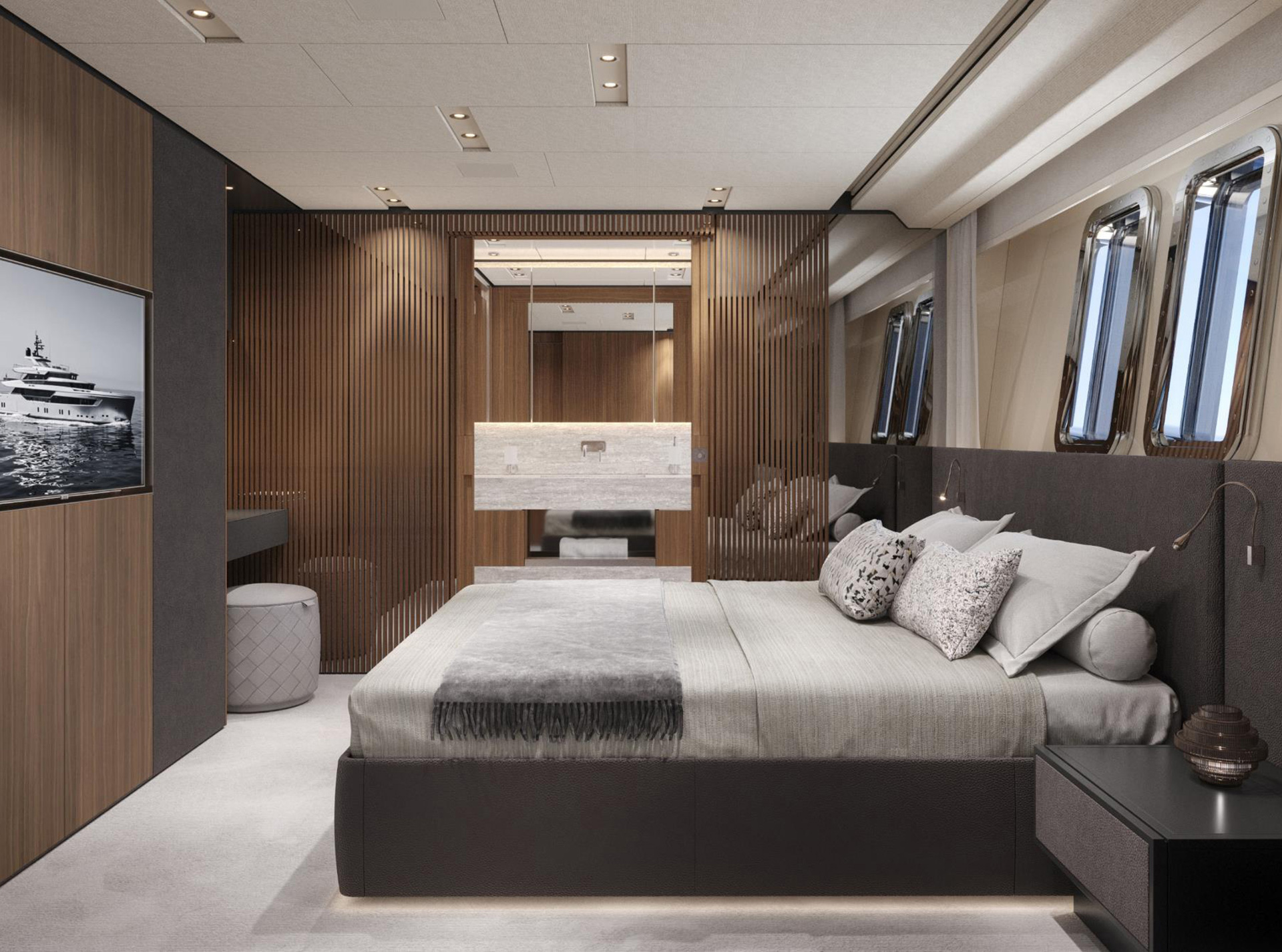 Interiors are conceived as fluid living spaces, where generous volumes, panoramic views and meticulously selected materials create a sanctuary of comfort and modern refinement, elegantly connecting interior and exterior life at sea.