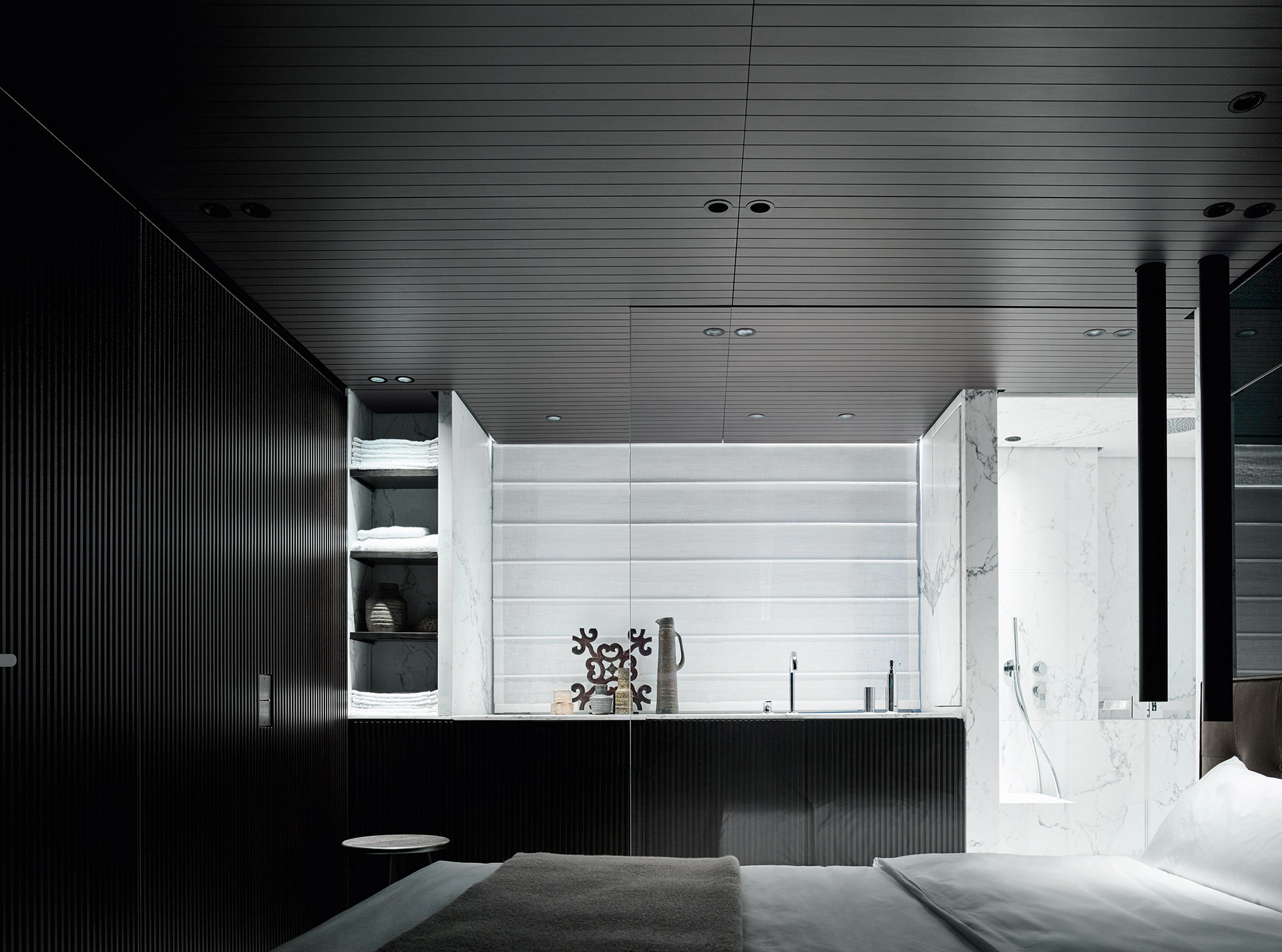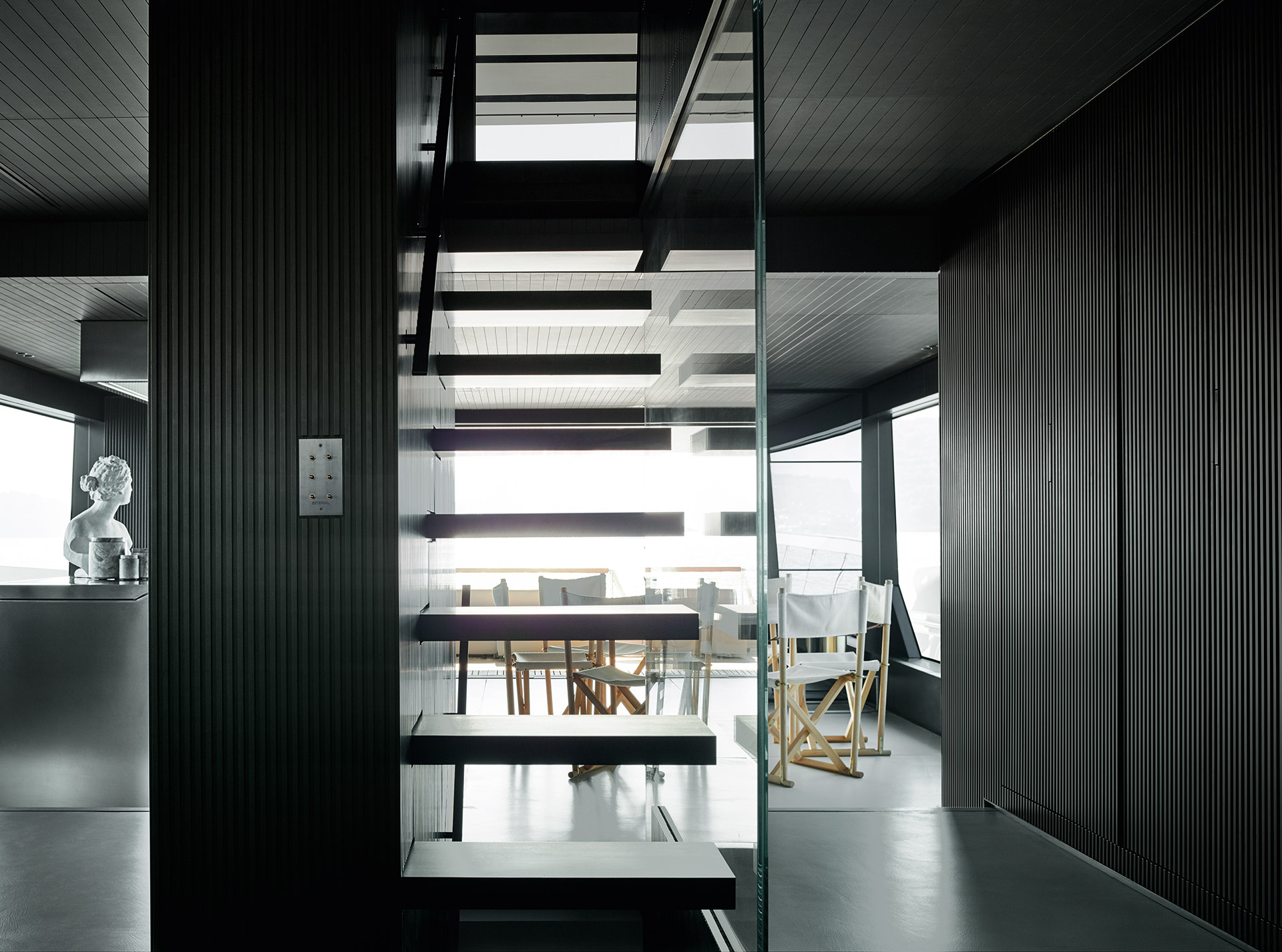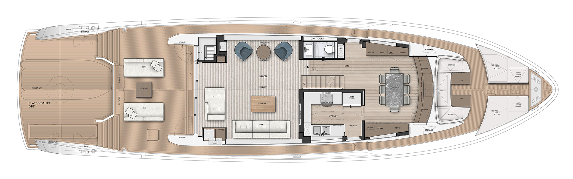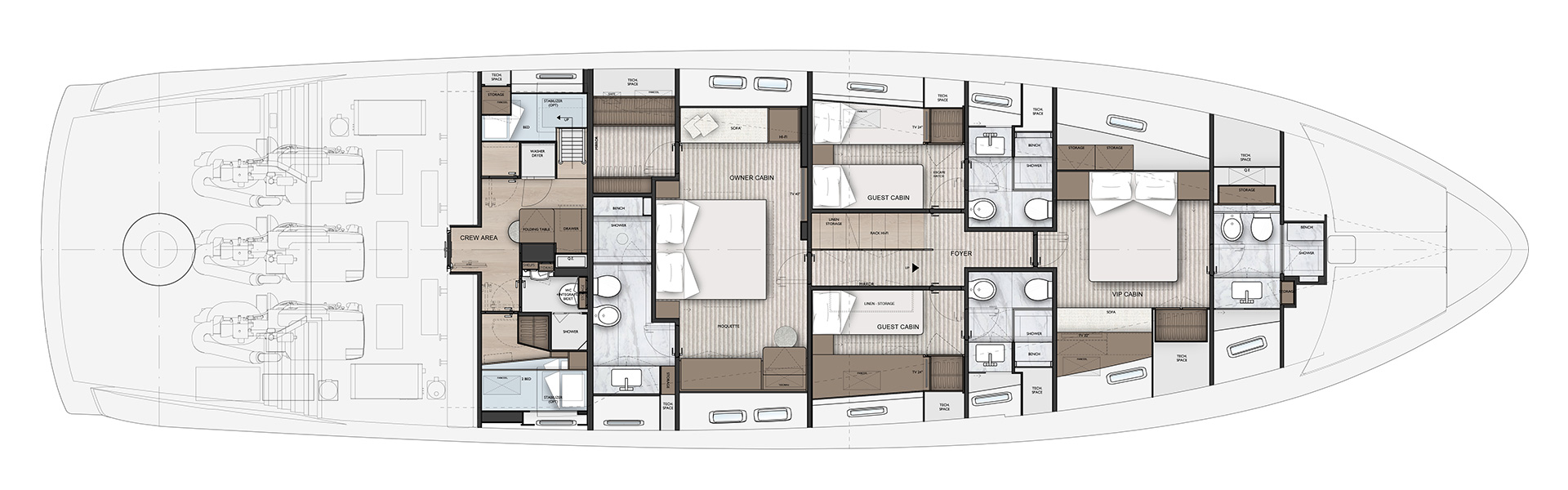 Understated and architectural, the interiors prioritise space over ornament. Clean lines, balanced proportions and soft textures create a composed atmosphere, where light, comfort and functionality define a sophisticated onboard experience.